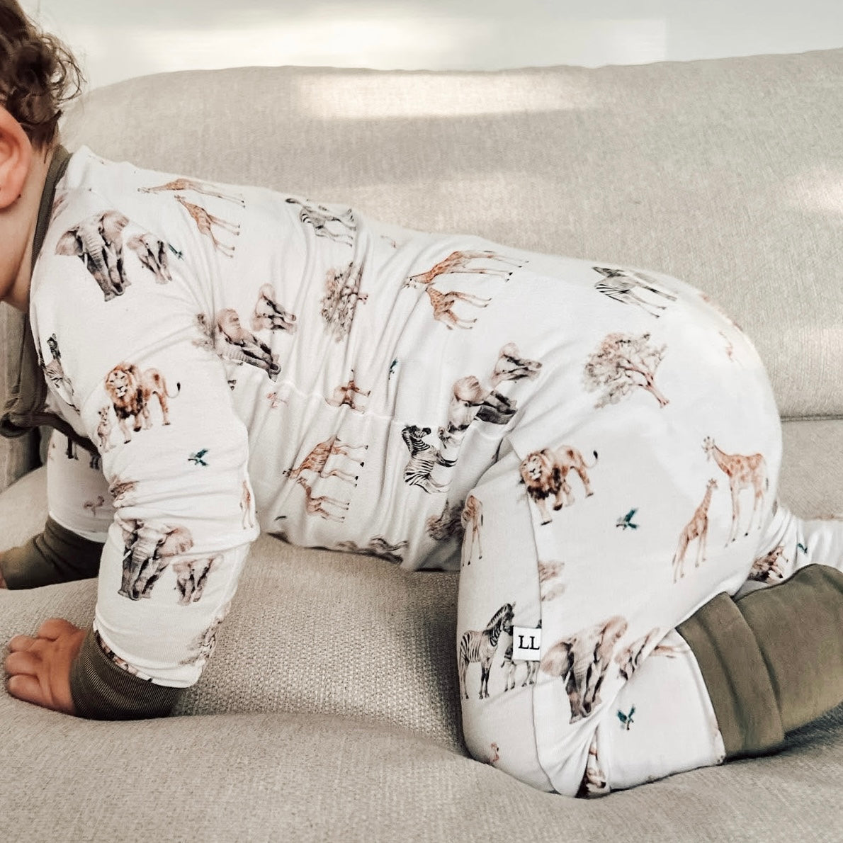 Let your little explorer drift off on a dreamy safari through the animal kingdom. Set on a neutral background with deep olive accents, these wild animals are simply stunning.